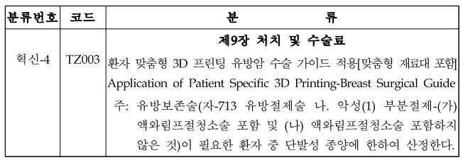 제5편 제2부 제2장 검사료 혁신-3 유전자 발현을 통한 알고리즘기반의조기 유방암 환자의 예후검사란 다음에 제9장 처치 및 수술료혁신-4 환자 맞춤형 3D 프린팅 유방암 수술 가이드 적용[맞춤형 재료대포함] 란을 다음과 같이 신설한다.